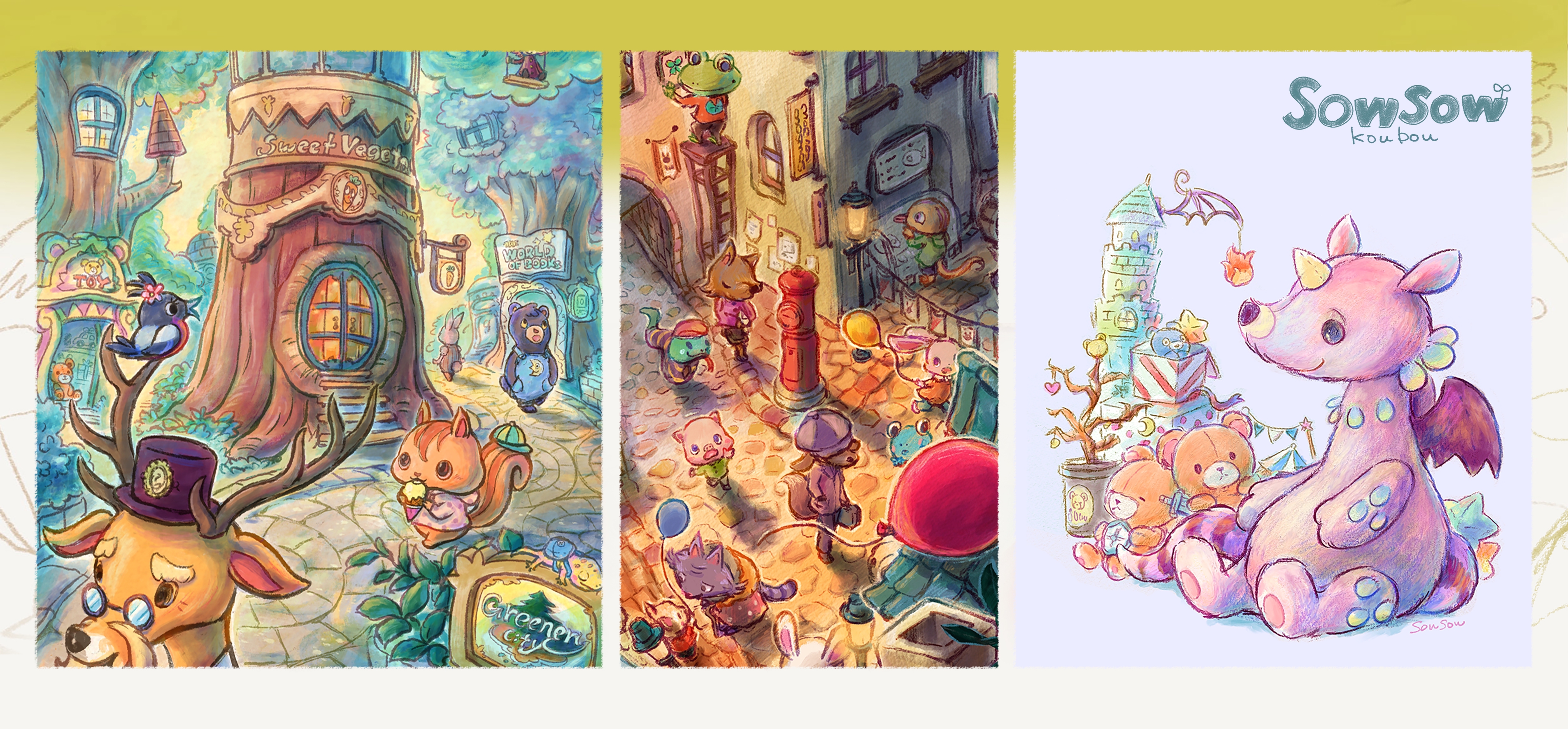 sowsow氏のオリジナル作品もメルヘンな世界観における動物のキャラクターが多く登場します。
