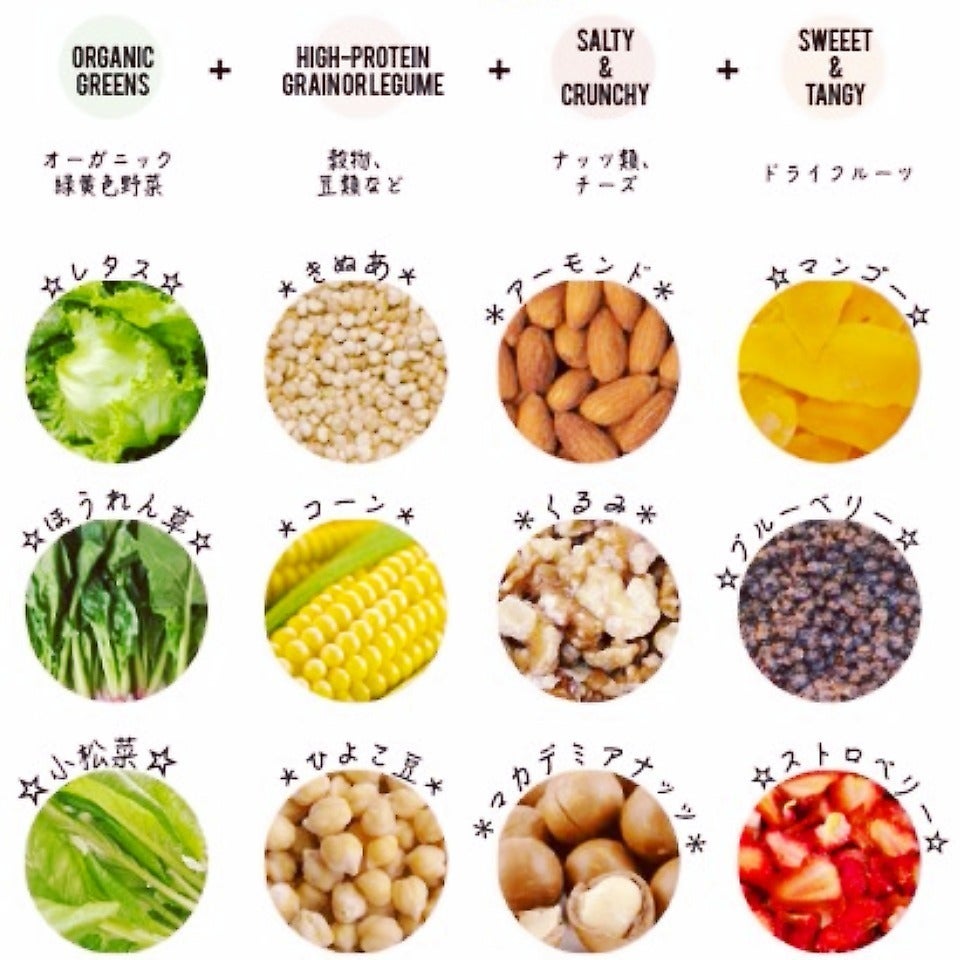 その次にくるのは穀物やプロテイン、大きくて噛みごたえのあるものをいれます。これは他のデリケートな材料が濡れてしまうのを防ぐためです。
