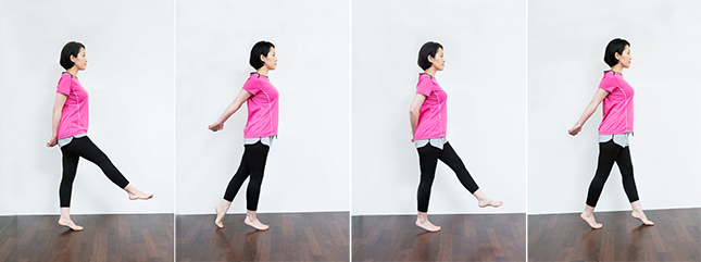 右脚を前に出して組んだ手を後ろに大きく振り上げ、つま先から着地しながら組んだ手でお尻をポンとたたき、同時に今度は左脚を前に出します。右脚と左脚を交互にテンポよく5回繰り返します。