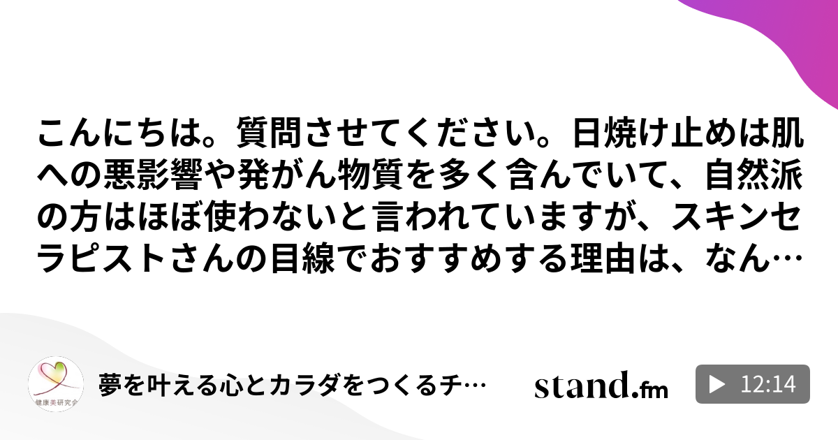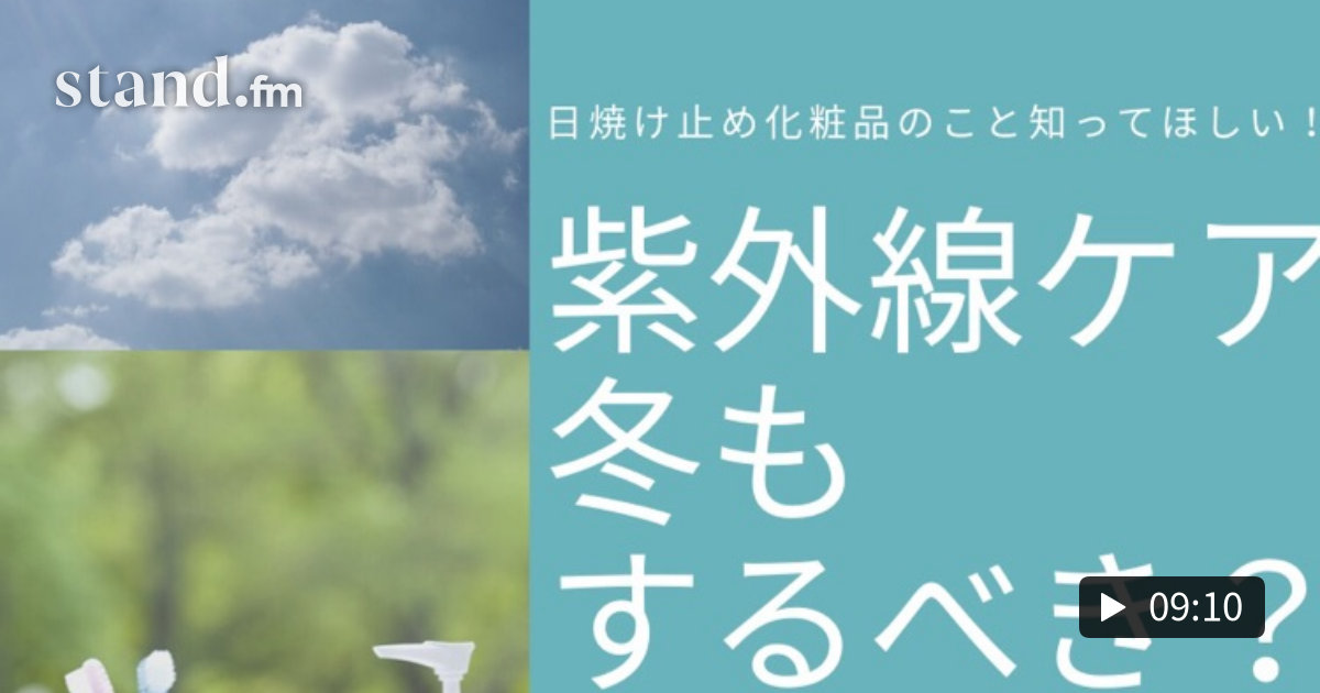 紫外線ケアの不安をなくしたい!スタンドFMにて、レターを募集しております。紫外線ケアについてのご質問をいただきましたのでお話しました!こちらの配信を聞いてくださってのご質問と思われます✨#73 日焼け止めは1年中使うべき? - 夢を叶える心とカラダをつくるチャンネル | stand.fmあえて、冬に日焼け止めのことをお話ししました! 冬も日焼け止めされてる方は美意識高いです✨ だからそこ、知っていただきたく思います。 #スキンケア #元気でキレイ #健康美 #五感 #ニキビ #肌は変わる #化粧品 <人気の配信> #28 更年期の症状に個人差が出る理由を考えた …stand.fm#74 レターへのお返事|紫外線ケアを推奨する理由は? - 夢を叶える心とカラダをつくるチャンネル | stand.fm前回の配信にレターをいただきました! ありがとうございます✨ #スキンケア #元気でキレイ #健康美 #五感 #ニキビ #肌は変わる #化粧品 <人気の配信> #28 更年期の症状に個人差が出る理由を考えた https://stand.fm/episodes/5f7d51b38f5bc0…stand.fmスキンケアのこと、健康美のこと、スキンセラピストの目線でお話しています。1つの参考にしていただけると嬉しいです✨