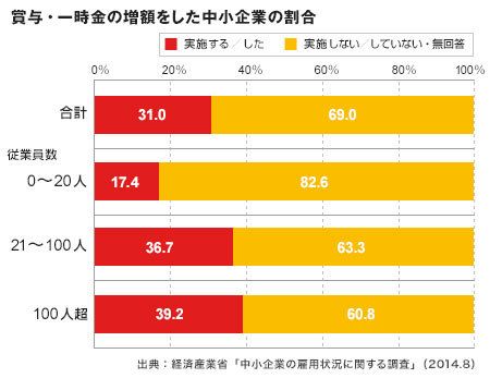 経済産業省の中小企業1万0380社の調査では、2014年度のボーナスを増額すると答えた企業はわずかに31.0%。69%の企業が増額しないと答えているのだ。