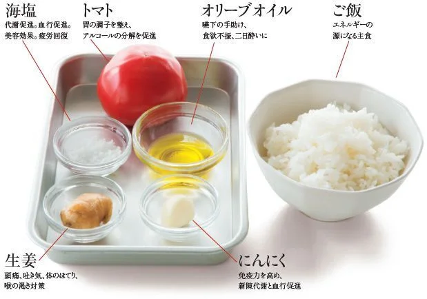 この「トマトかけご飯」に使われている食材は、生姜をはじめ、二日酔いの症状をやわらげる働きのあるものばかりです。飲む機会が多い時期、お酒が弱い人は、ぜひこのつくり方を覚えておいてください。でも、だからと言って、今以上に飲みすぎるのは、控えてくださいね。