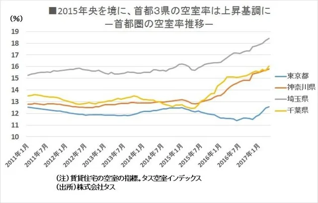 だが、マクロ指標を都道府県別に見ると、少し違った賃貸住宅市場の姿が浮き彫りになる。トヨタ自動車などが出資する不動産評価・情報提供会社「タス」は、首都圏や関西圏の空室率を毎月、集計・公表している。その空室率インデックスで見ると、首都圏では東京都心部はさほどでもないが、埼玉や神奈川、千葉の各県で特に2015年後半以降、空室率が急上昇している。