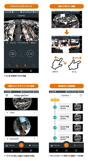 1台のKalay Homeにつきスマートフォン4台まで同時アクセス可能。また、スマートフォン1台で最大16台のカメラをモニタリングできる。