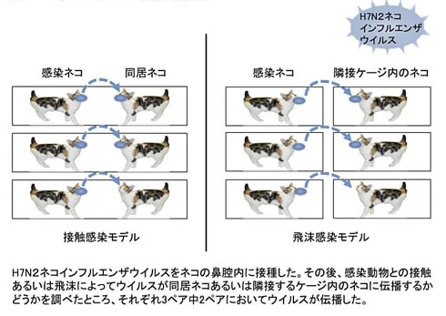 しかし、ネコを用いた実験では、ウイルスは肺、気管、鼻で効率よく増殖。ネコの大部分は大きな症状が見られなかったが、フェレットと違い飛沫感染と接触感染の両方を確認したという。