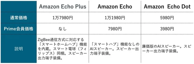 そのAIスピーカーの戦い方を熟知したアマゾンが打ち出してきたのは、「お急ぎ便」のプライム会員向け価格も含めた、徹底的な「低価格」戦略だった。製品ラインナップは次のようなものになる。