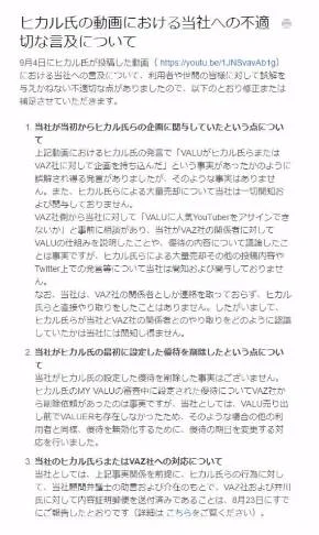 その一方で、「ヒカル氏らによる大量売却その他の投稿内容やTwitter上での発言等について、当社は関知・関与していない」と、“売り逃げ”への関与を否定。また、同社はVAZの関係者としか連絡を取っておらず、ヒカル氏らと直接やりとりしたことはないという。