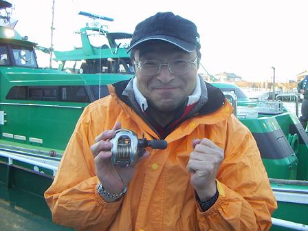 新調した高級リール「メタニウムmg7」を持って、ヤル気満々ですね~。こんなリールを買っちゃって、最初のうちは「猫に小判」、「豚に真珠」かと思っていましたが、それなりに結果を出しているので、まぁイイかと・・・・最近は「ギア比が高いのがサイコ~です」なんて言っていますが、ホントにワカッテいるのかどうかは『?』です。