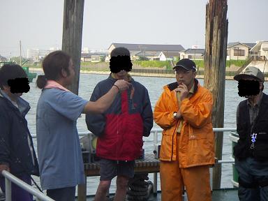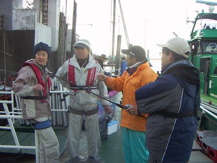 愛竿「サクラのフグ竿」を手に、仲間のビギナーさん達に能書きを披露している光景です・・・・「この極先調子がイイんですよ~」なんて言っているんでしょう・・・・ちなみに、この高級竿の穂先を2回も折ってしまって、日々、「この竿には5万円も掛けている」なんて自慢しています(笑)
