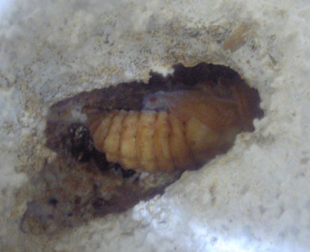 能勢産B、写真撮影先日蛹化した能勢産Bを写真撮影してみた!実は昨日も覗いたのだが、その時はオシリ側のスペースにニョロ時代の頭が!そのままの形で残っていたので、今日はそんな記念撮影!と思ったのだが、頭の残がいはどこへ行ったのやら、見当たらない。。。(分解されちゃったかな?)初めに羽化したホペイの♀と比べると大きく見えるのは気のせいかなぁ~?(^^)