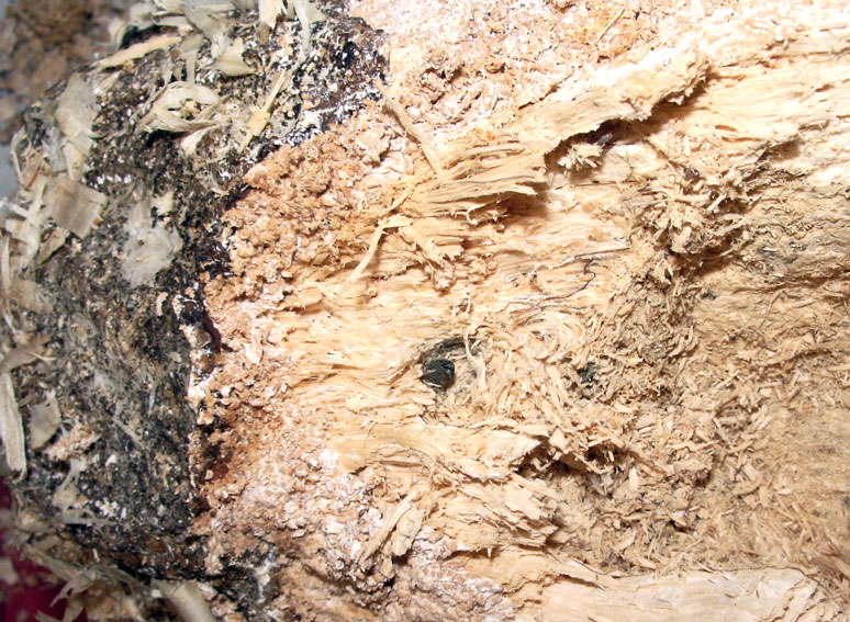 削り屑は穿孔面には出ず、突き抜けた材下部にビッシリ!