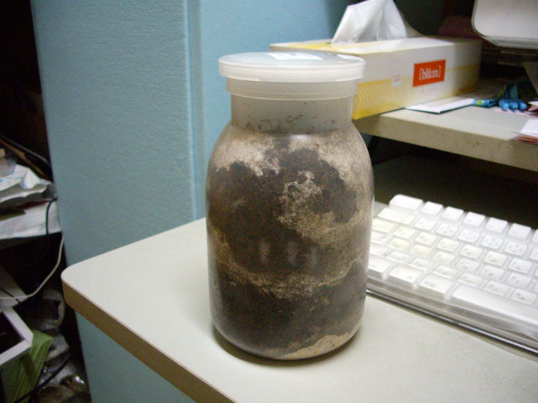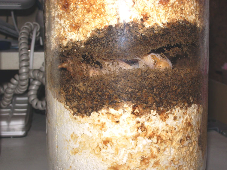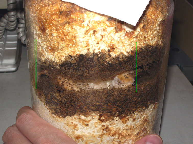 ビンの最下層に蛹室とも思える固さに部屋を形成してました。