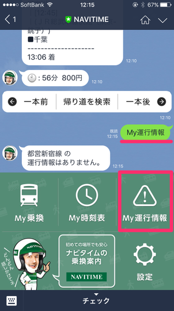 例えば、「新宿から千葉」とメッセージを送ると、現在時刻に合わせた乗り換え案内を一瞬で送ってくれるんです!