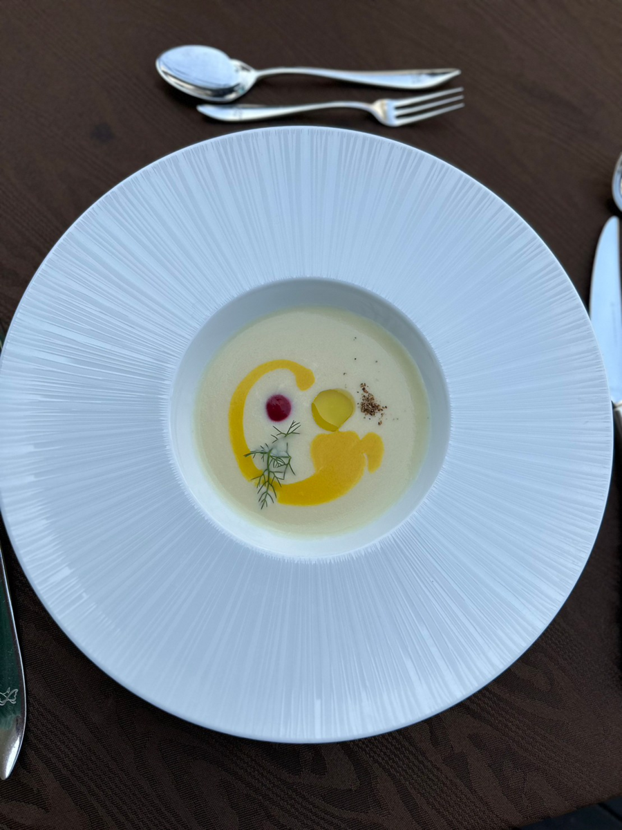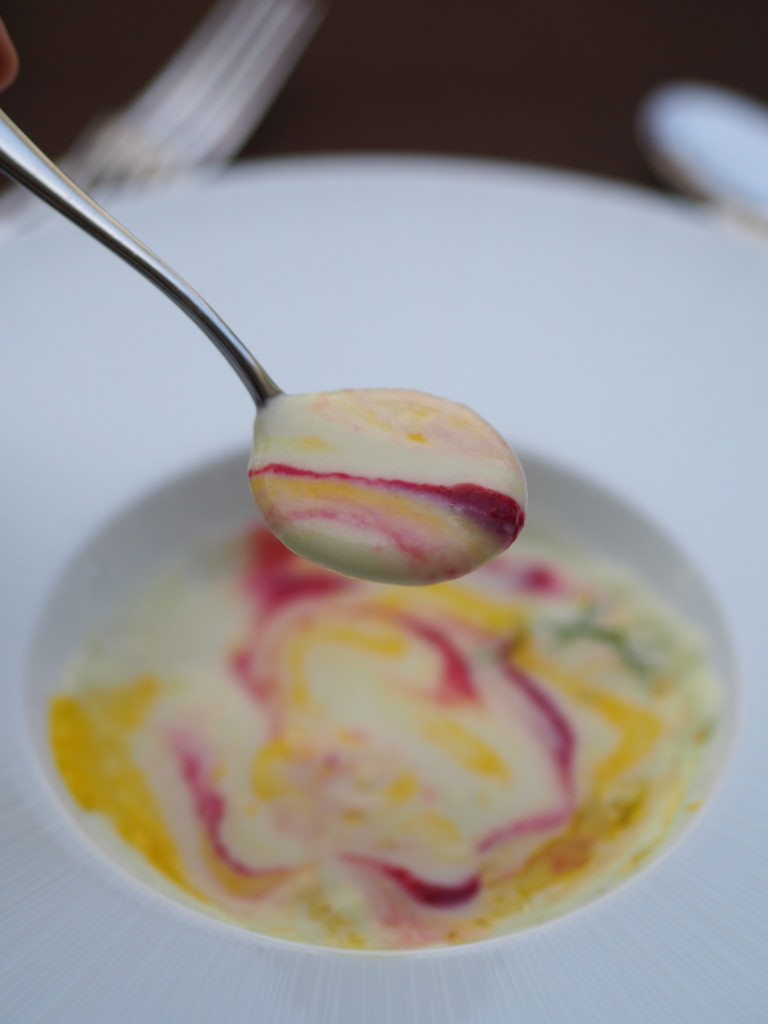 ▪️スープ:カブとビーツのポタージュ 完熟かぼちゃの甘味を添えて