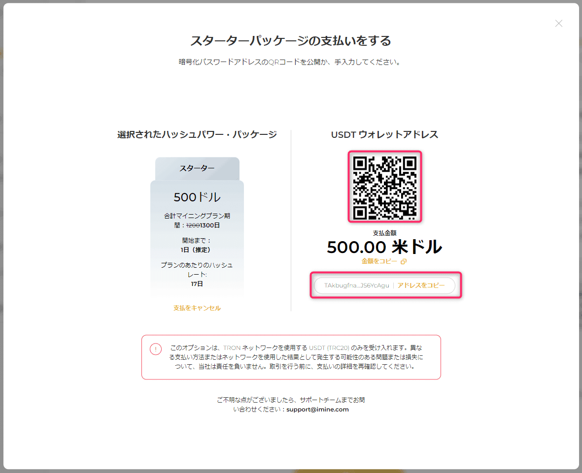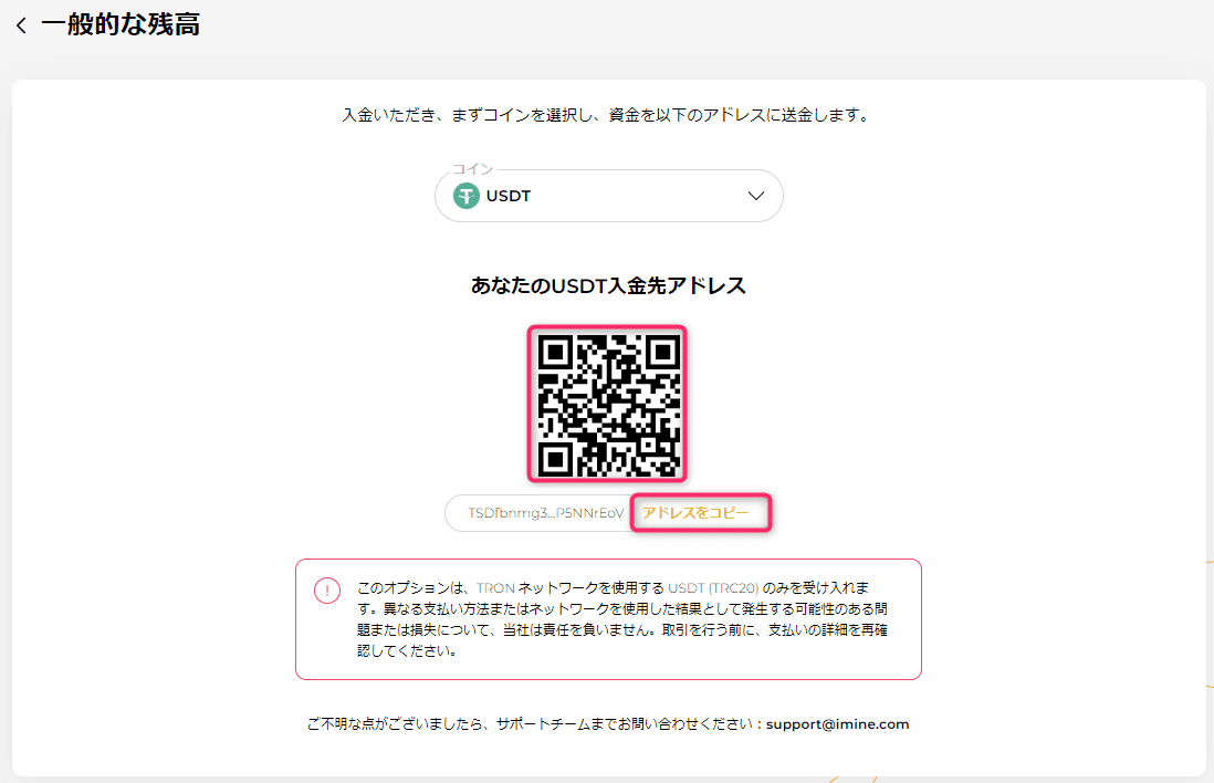 入金可能なUSDTは、TRC20となりますのでTron(トロン)ベースとなります。お気を付け下さいませ。