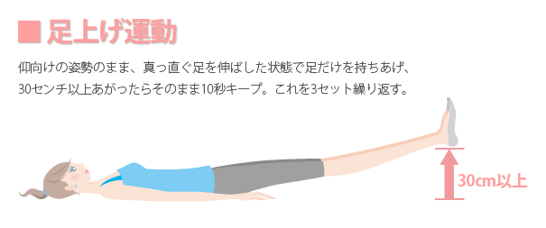 布団の上などでも行える簡単な体操です。上体に戻れずに下半身に溜まってしまった血液を、心臓に戻してあげましょう。重力によって足は血液が溜まりやすい部位です。