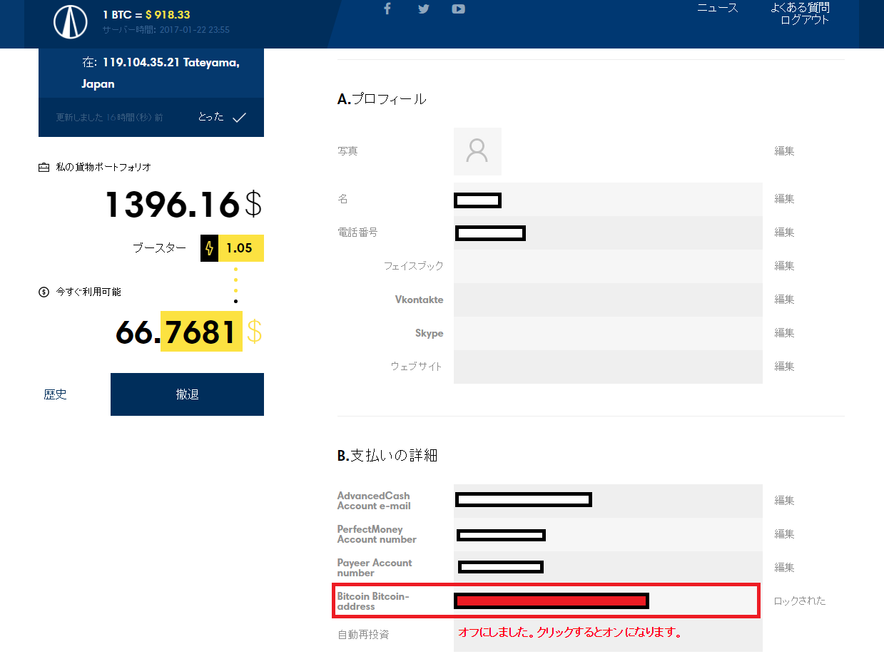 ②ページ下部にある「Bitcoin-address」へ出金先の受信ウォレットアドレスを入力ください。