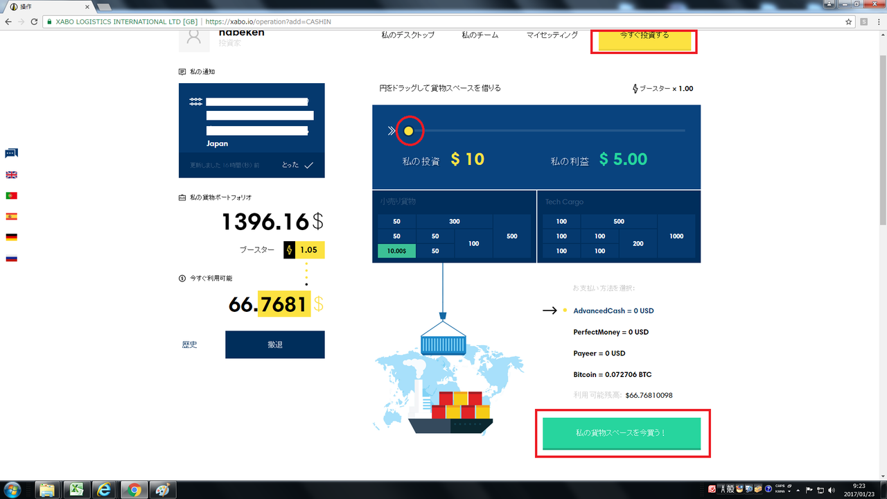 ②ページ下部にある支払い方法を【Bit coin】をクリックし、【私の貨物スペースを今買う!】をクリックする。
