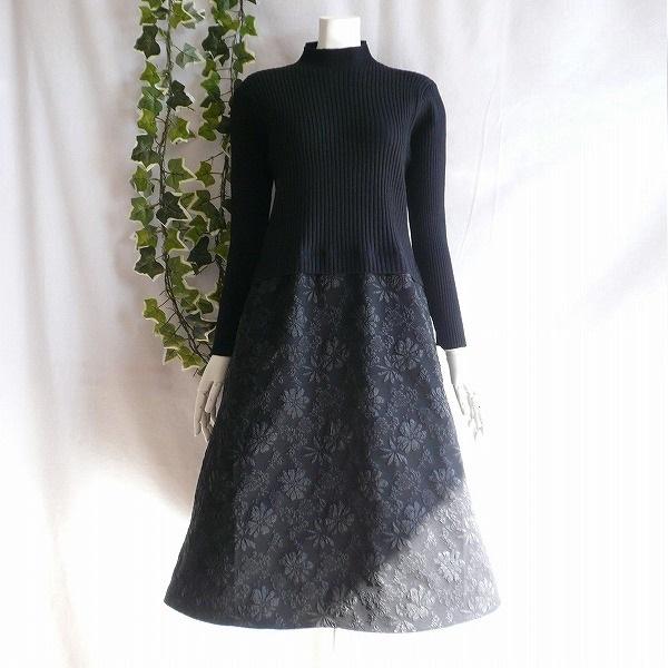 リブニットと膨れ花模様のスカートが異素材で切替されたレイヤードスタイル。