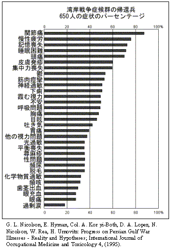 湾岸戦争症候群に罹っている帰還兵650人を対象とした調査によれば、彼らが訴えている慢性的な症状は、脱毛や頭痛、関節痛、胃痛、下痢から記憶障害、睡眠障害等々、多岐にわたります(右図)。症状の多様性が、劣化ウラン被害=湾岸症候群の一つの特徴です。