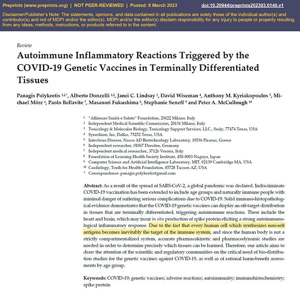 3) 遺伝物質とスパイクタンパク質はともに長期間(数ヶ月から数年)持続し、永久に残るかもしれない自己免疫症候群を引き起こすのに十分な長さである。』
