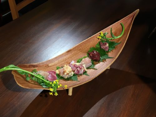 宮崎の地頭鶏の刺身、胸肉、もも肉、心臓、レバー