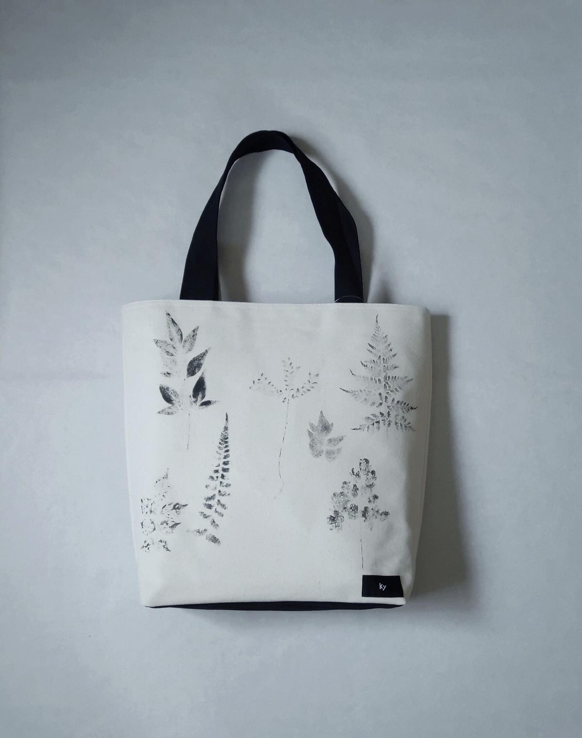 トートバック346W41H36.5D11押し葉をそのまま大胆に型押したkyオリジナルのトートバック墨を使用ているので1年以上布を乾かし商品にしています。充分に乾かし防水スプレーをかけておりますが、こまめに防水スプレーをかけてメンテナンスする事をおすすめします。kyoriginal.stores.jp