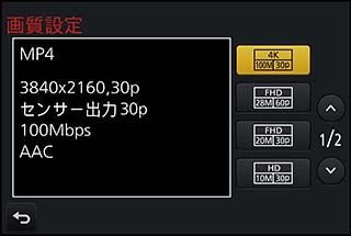 4K動画モードは、3,840×2,160/30pの「MP4/100Mbps」という1モードしかなく、LX100にはあった24p撮影モードはなくなっている。また4K動画の連続撮影時間は、15分までとなっている。同社製ビデオカメラ「HC-WXF990M」では、4K動画のビットレートは60Mbps(平均)しかなかったことを考えると、デジカメ系では100Mbps、ビデオカメラ系では60Mbpsがデフォルトになっているようだ。