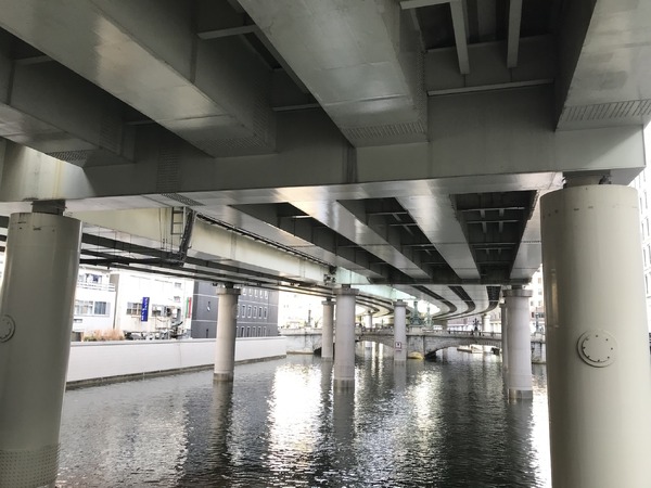 現在日本橋付近で日本橋川上空を通る都心環状線を、
