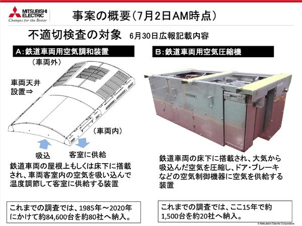 鉄道用の空調装置は通常、鉄道会社など取引先が指定する検査をして報告する必要があるが、そのようにしようという気配は全くなかったそうだ。不適切な検査を行った長崎製作所では、1985~2020年に空調設備を国内に約6万8800台、海外に約1万5800台、計約80社に出荷した。また、空気圧縮機は国内に約1500台、約20社に出荷した。
