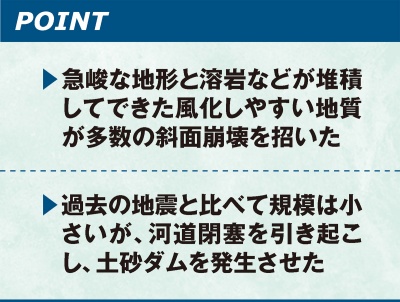「地形に加えて、地質的にも崩壊しやすい条件がそろっていた」。こう話すのは、産業技術総合研究所活断層・火山研究部門の吉見雅行主任研究員だ。溶岩や火砕流が堆積した地層が隆起して形成した箇所が多いため、風化しやすく、崩れやすい。