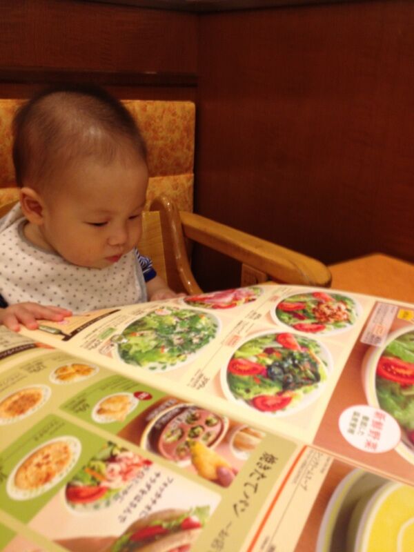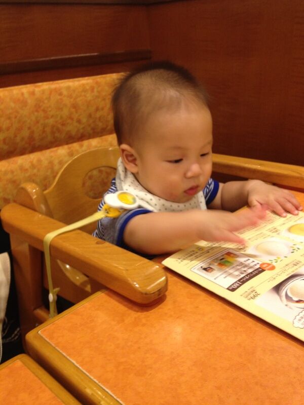 龍くんは、サイゼリヤで初めてのハイチェア!まだご機嫌悪くて笑わない。。。