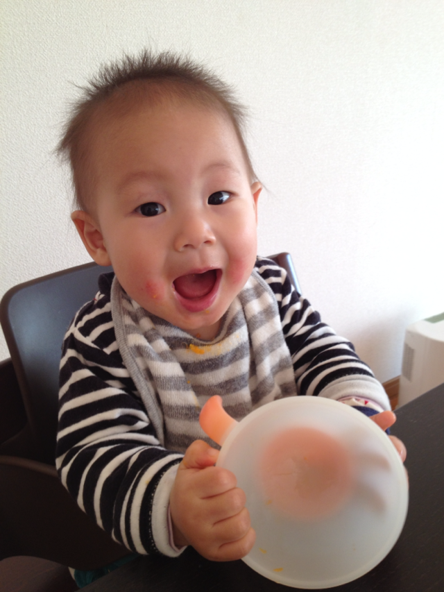 お初の蒸しパンはやっぱり好きじゃないみたいで、私のパンをモグモグ食べてたよ!それだけでも足りず、みかんの皮をむいてあげたのを器に入れてあげたら、自分でつかんで食べたー!!!もちろん最初は落としたけど、2回目ぐらいから食べられるようになってて、しかもその時の嬉しそうなドヤ顔が最高に可愛かった