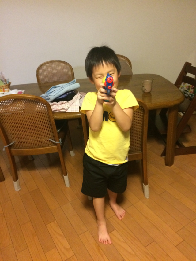 キッザニアでお仕事して貯めたお金で龍くんが水鉄砲を買ってきた。