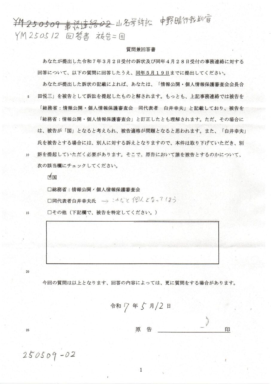 Ⓢ YM 250401 事務連絡に対する回答 山名学訴訟