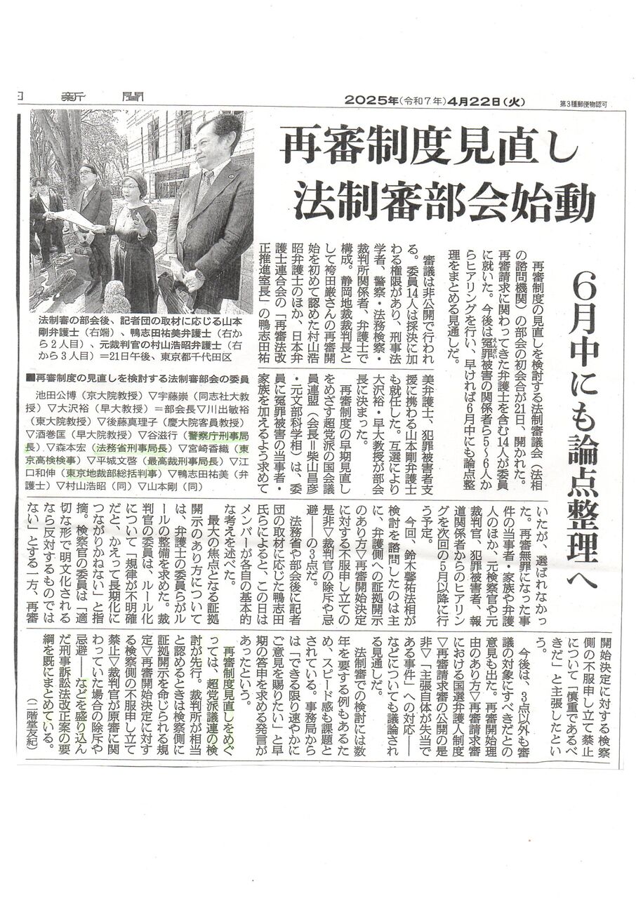 250422 朝日新聞 法制審部会始動 再審制度見直し 審議は非公開