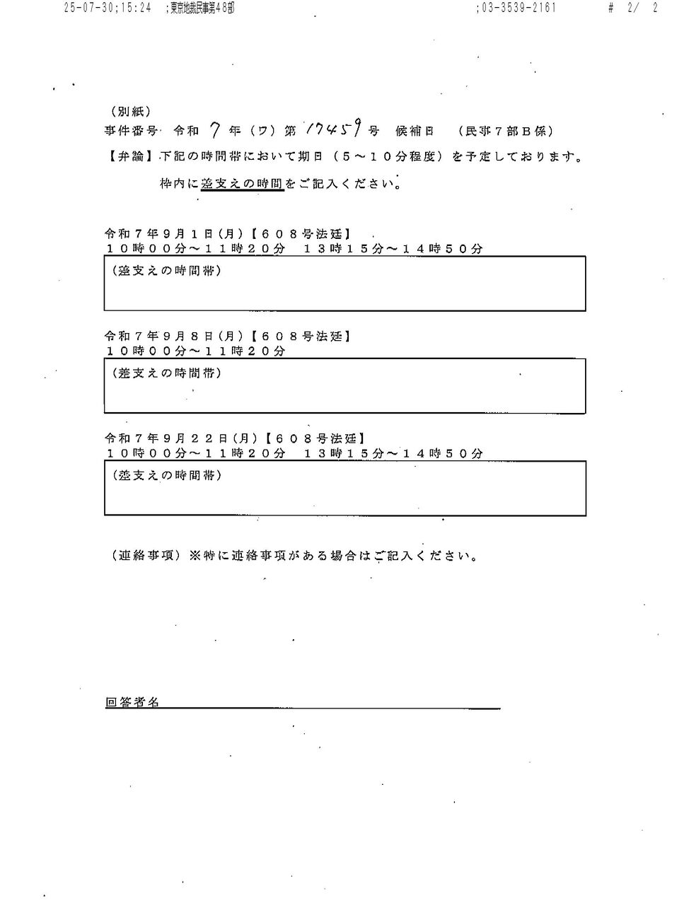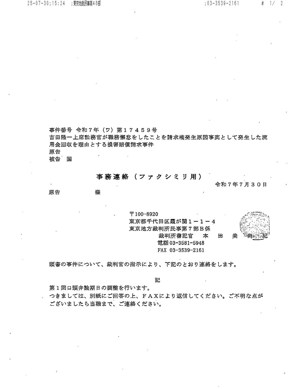 画像版 YR 250730 期日選択の連絡 吉田隆一訴訟 秋田純裁判官 事件番号通知