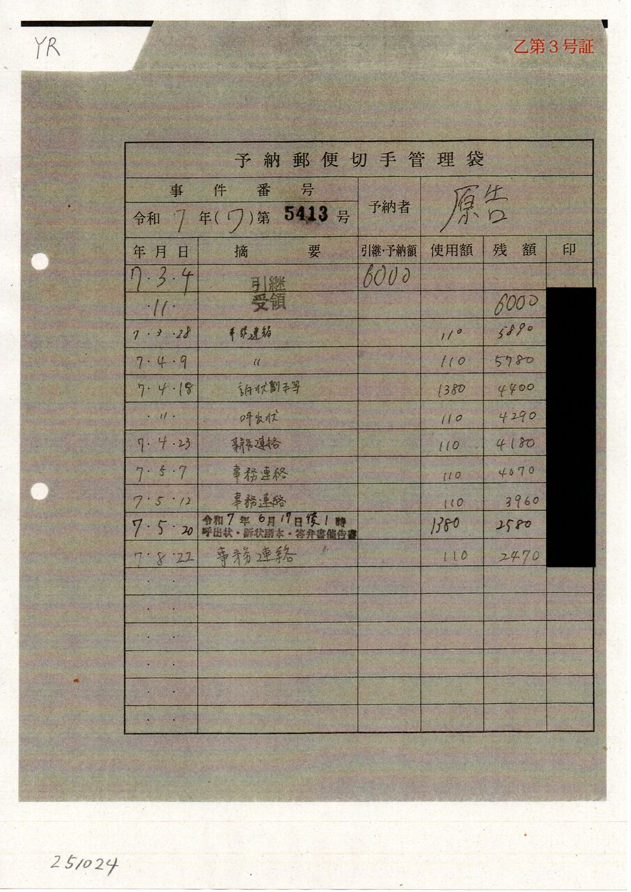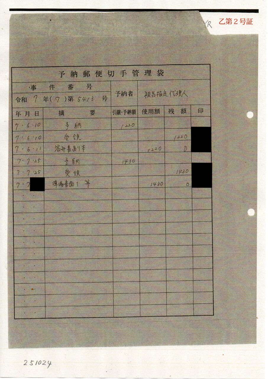 画像版 YR 251022 乙2と乙3号証 吉田隆一訴訟 秋田純裁判官 訟務専門支援専門官 予納郵便切手管理袋