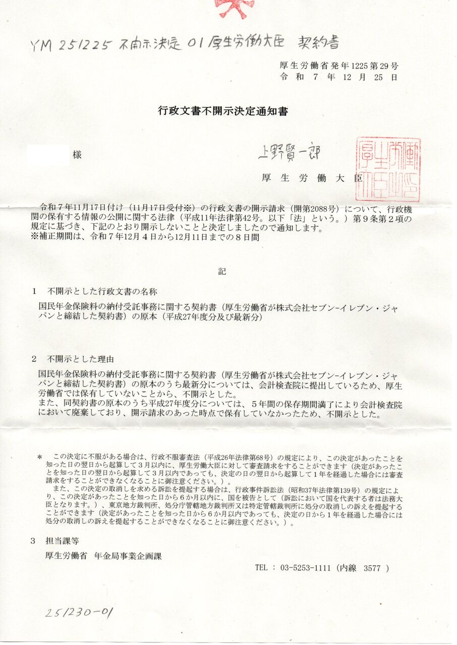 画像版 YM 251225 不開示決定 厚生労働大臣 契約書 上野賢一郎議員