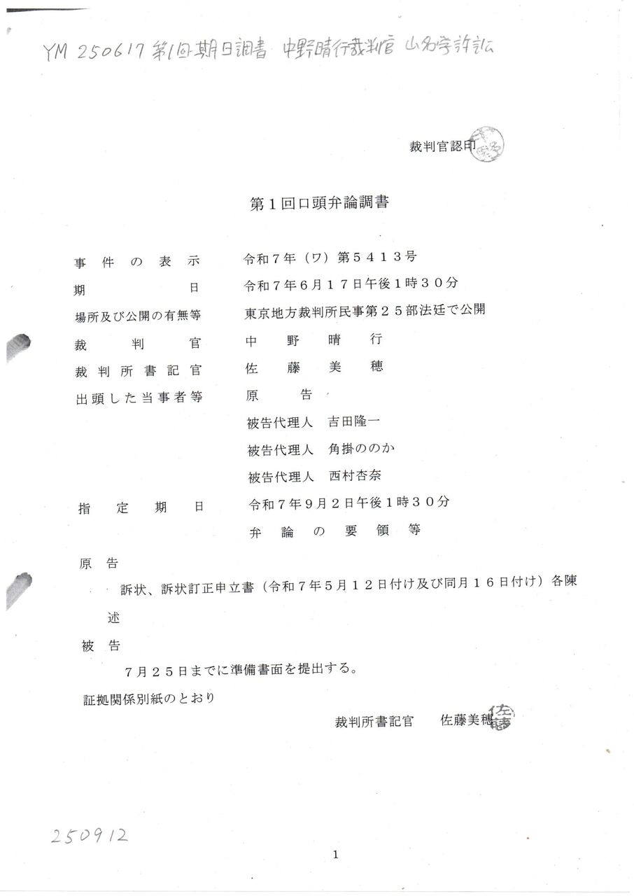 〇 YM 250617 第1回期日調書 中野晴行裁判官 山名学訴訟