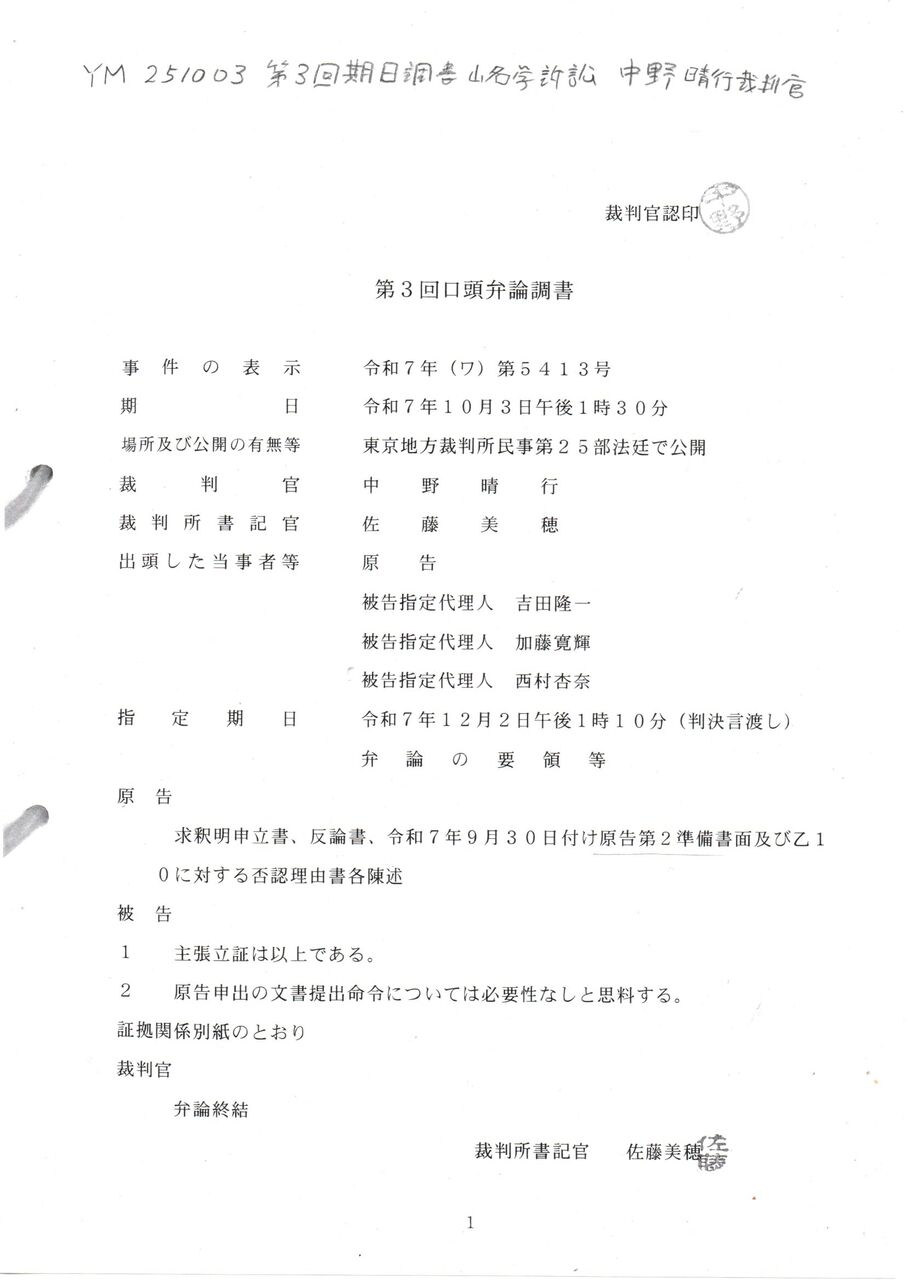 〇 YM 251003 第3回期日調書 山名学訴訟 中野晴行裁判官