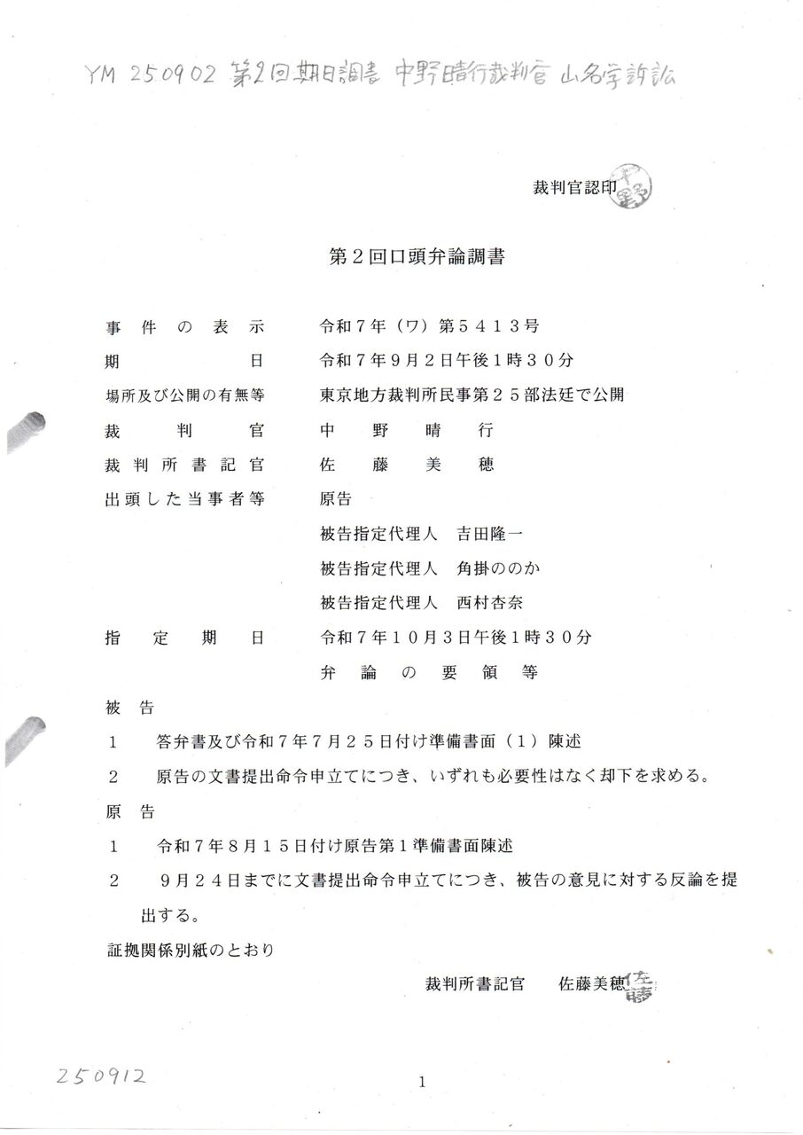 〇 YM 250902 第2回期日調書 中野晴行裁判官 山名学訴訟