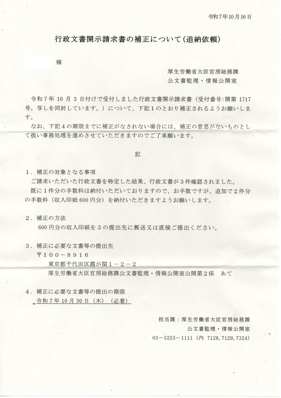 令和7年10月16日付で厚生労働省より通知された「行政文書開示請求書の補正について(追納依頼)」において、行政文書が3件と判断され、追加で2件分の手数料(収入印紙600円分)の納付を求められた。