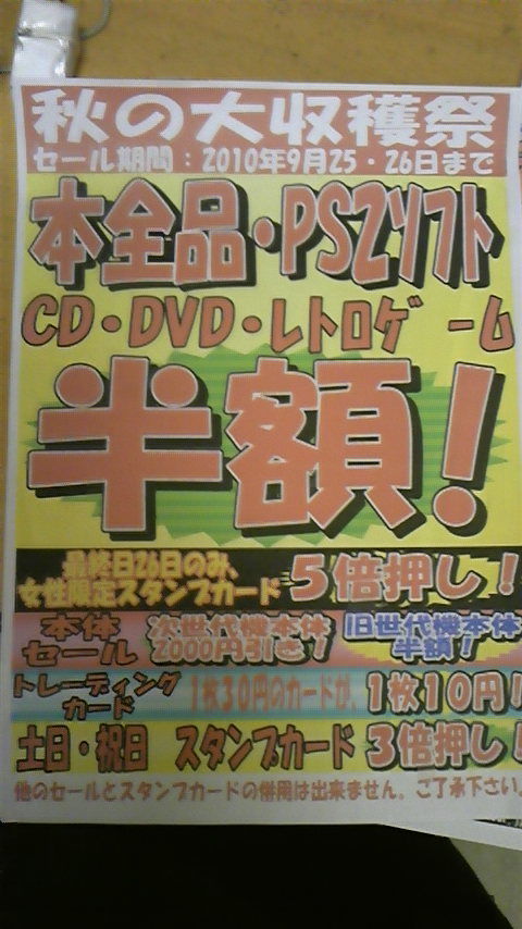 25・26日限定!秋の大収穫祭、ラスト2日間本全品半額PS2ソフト半額本体、次世代機2000円引き旧世代機半額カード、30円以下の商品が10円100円以上が半額スタンプカード3倍押し26日のみ女性限定で、なんとスタンプ5倍押し是非是非ご来店下さい