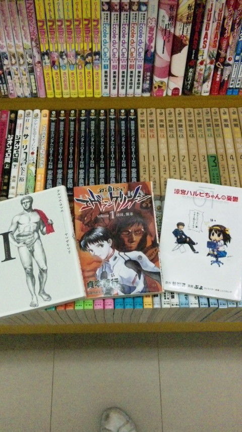 スタッフお すすめ商品(^ω^)新人スタッフのIです!BM玉島店のスタッフになって、約1ヶ月半……今日やっと名前プレートを頂きました!また探してみてください!笑今日は私のおすすめ商品を紹介させていただきます(´∀`)写真左から「テルマエ・ロマエ」、「エヴァンリオン」、「涼宮ハルヒちゃんの憂鬱」です(^ω^)どれも面白いですよ~(゜∀゜)エヴァはセットでも販売しているのでお得です♪商品の場所が分からなければ、気軽に声をかけて下さい(^ω^)