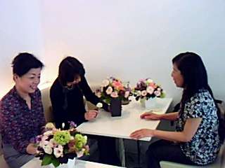 うちにはケーキ教室だけでなく、フラワーアレンジメントの教室もあるんです。お花の先生と、私の家内である専務と、常連客の3人だけですが、3年間ずっと続けています。興味のある方はぜひ参加してください。お花の勉強の後は、ケーキセットがサービスでつきます。先生と一緒にティータイムをお楽しみください。