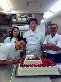 私達の店で頑張ってくれている三原君の結婚式を翌日に控え、三原くん夫妻と、三原君のお父さんと、おもだったスタッフと私で、ウエディングケーキを一緒に作りました。