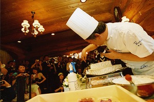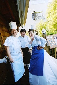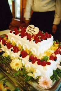 ボックサンで3年間がんばってくれた森玲子さんの結婚式に参列させていただきました。森さんはとてもケーキが好きで、お菓子の製造だけでなく教室の助手などいろんな面で助けてくれました。披露宴会場で、昨年の「ぴったんこカンカン」で歌った「お嫁においで」「君といつまでも」「旅人よ」など、4曲歌いながら、デコレーションケーキにお客さんの前で作りました。これまで色々とお菓子を作りましたが、歌いながら人前で作ったのは初めてだったので緊張しました。しかしお客さんに喜んでもらえたのでよかったです。