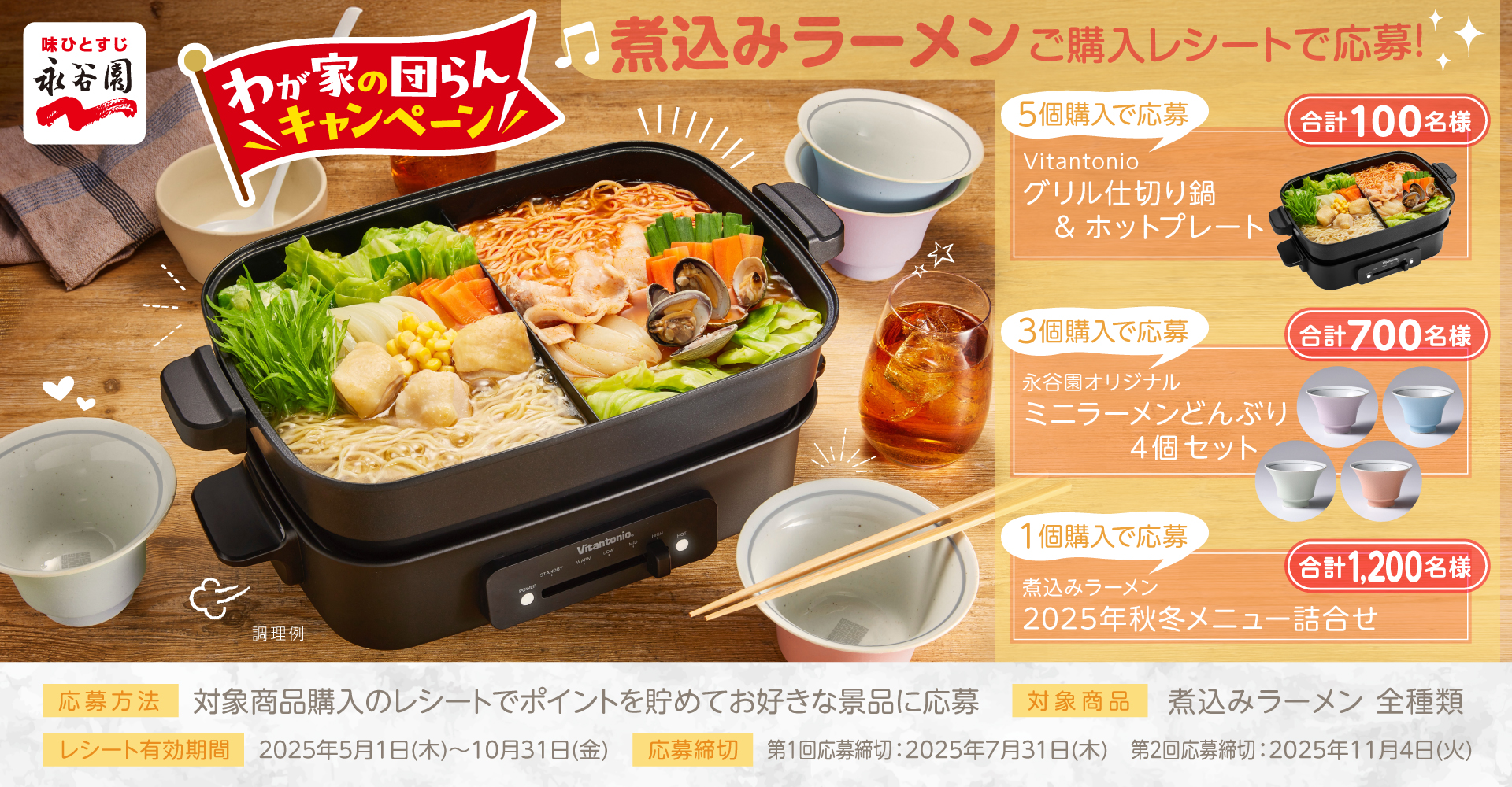 煮込みラーメン わが家の団らんキャンペーン「煮込みラーメン」購入レシートでポイントを貯めて応募!抽選で合計2,000名様に選べる景品が当たるマイレージキャンペーンです。nagatanien.mileage-campaigns.jp