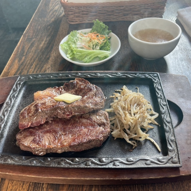 ステーキ250グラム、ご飯大盛り無料、スープ、サラダ付きで、このお値段。